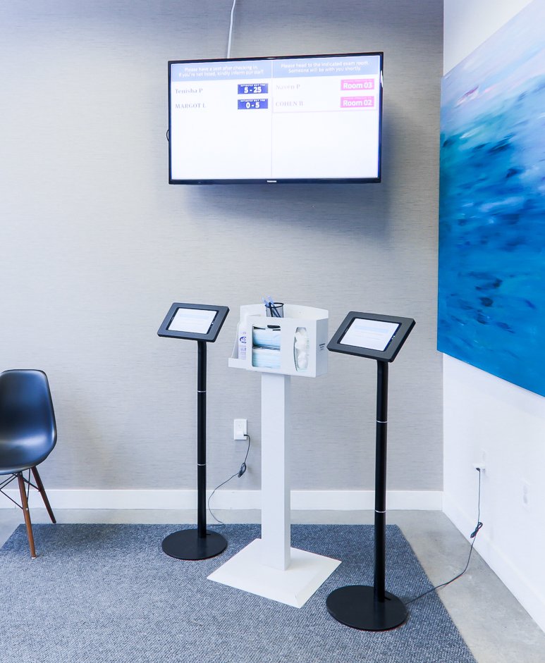 We deploy a portable tablet so that staff can easily manage what appears on the waiting room TV (in addition to real-time EMR integration) and to see patient wait times.