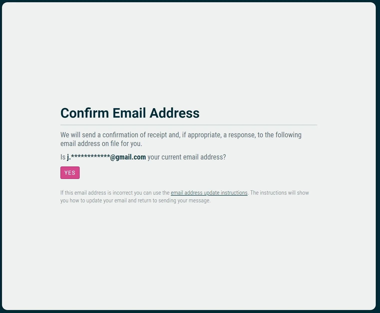 After verifying their OHIP details, patients are prompted to confirm their email address. For security purposes, part of the email address is partially hidden. This confirmation allows clinics to ensure accurate communication regarding the request.