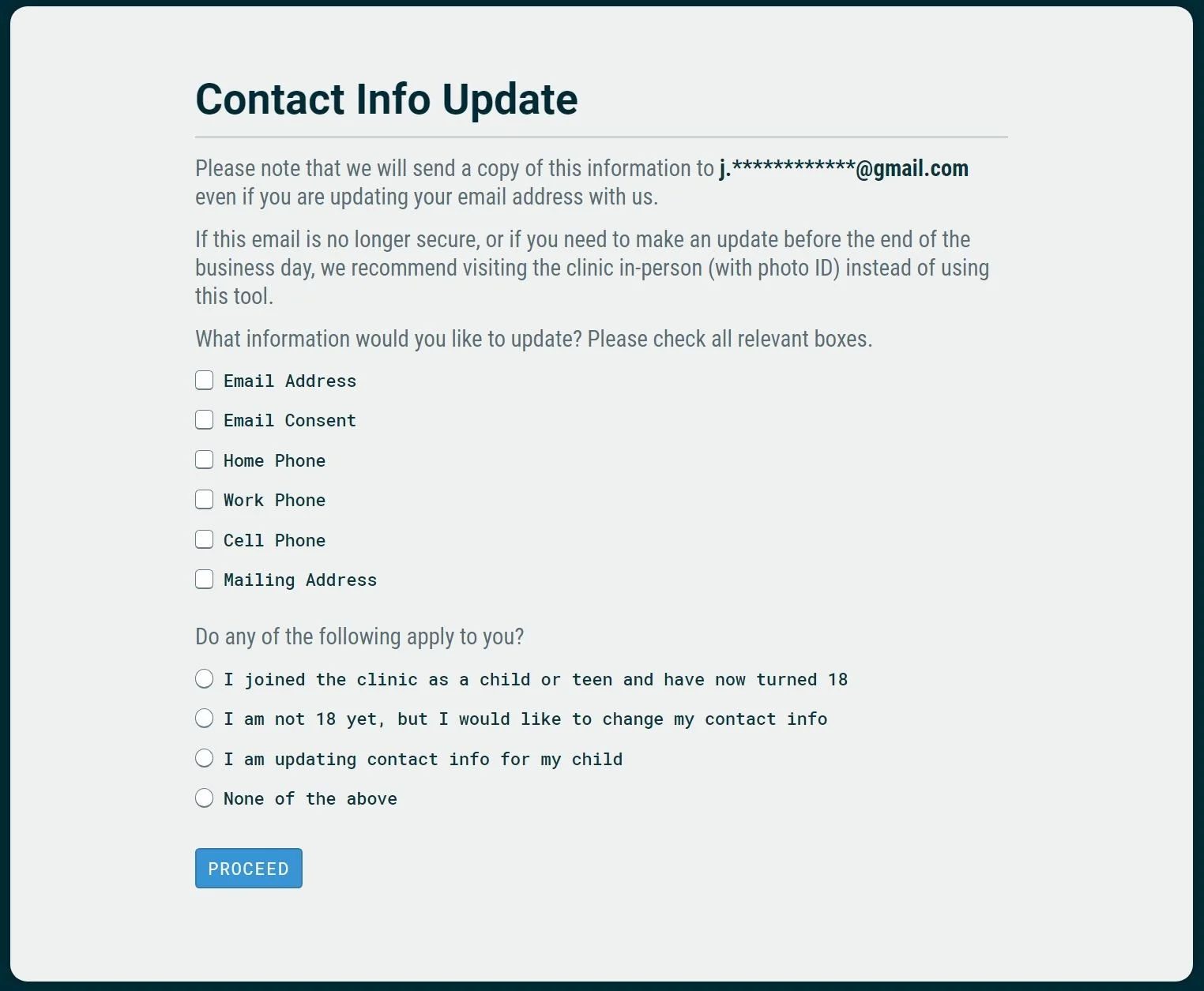 Patients will select what information that they would like to update, along with confirming specific nuances (e.g. patient just turned 18 years old).