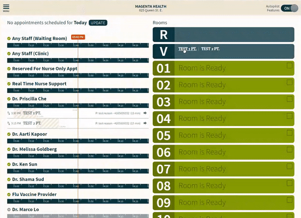 Virtual patients are integrated into the in-clinic workflow in a way that allows MDs to see single or multiple virtual patients in the same room at their own pace. You no longer need to remember to set patient rooms to unavailable or put your name on the room. Chime will put the room into a special status that includes your name when you're seeing virtual patients.