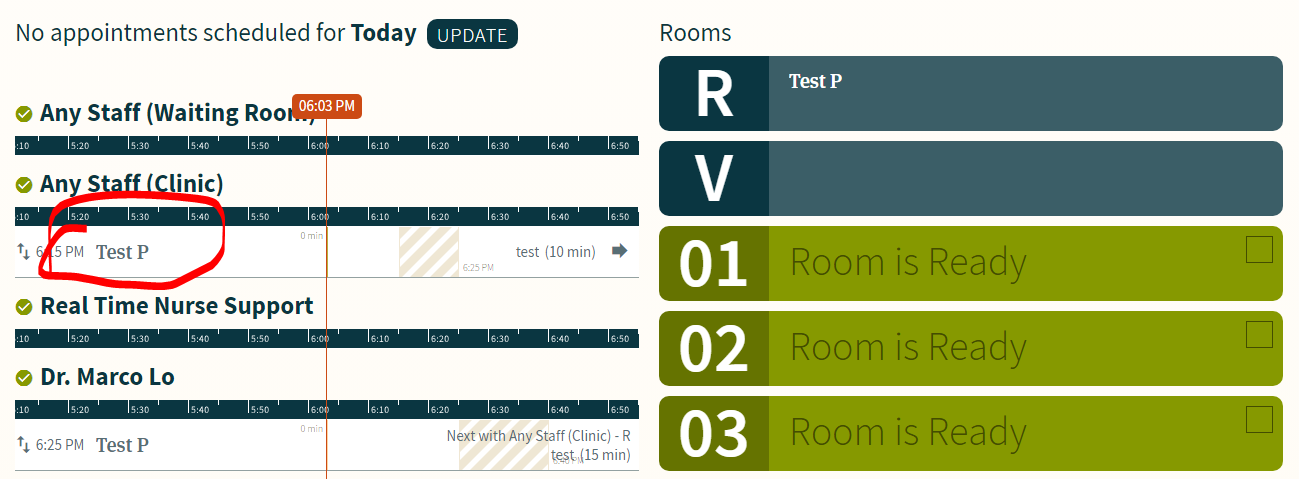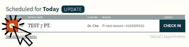 Hover over the patient’s name in the Scheduled for Today queue. On the left side of the patient’s name, click the red x.