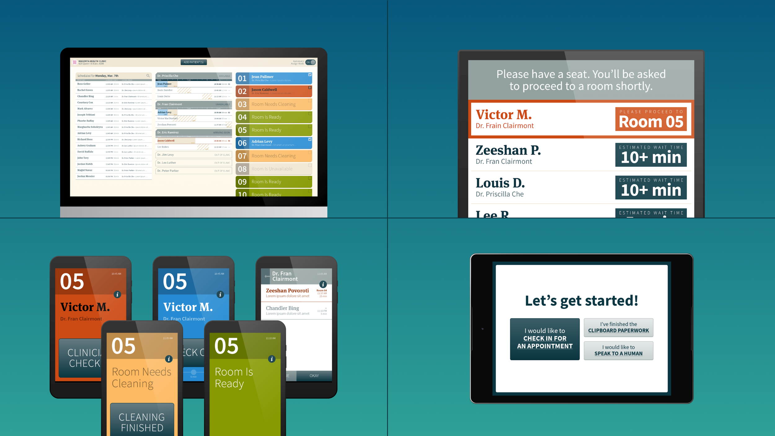 Put in more concrete terms, CHIME gives your clinic an AI that acts as a team of virtual staff for your clinic, interacting with people through dedicated hardware such as tablets, kiosks, and displays: