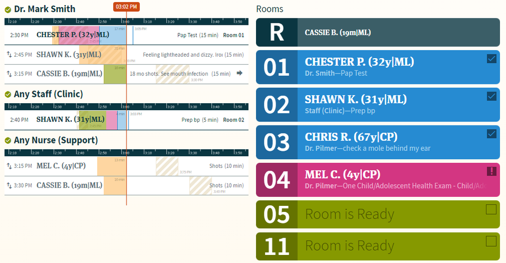 With CHIME, this information is managed within CHIME instead. Once patients are checked-in, they will show up within CHIME and staff and clinicians use CHIME to know which patients have arrived, their status, etc.