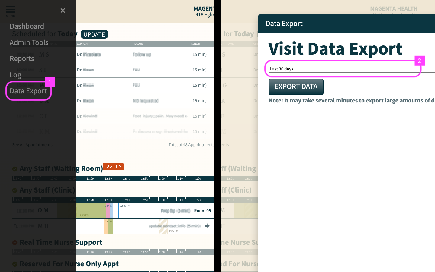 Within your CHIME dashboard, click the “hamburger” menu icon at the top left of the flow view, then choose “Data Export”.